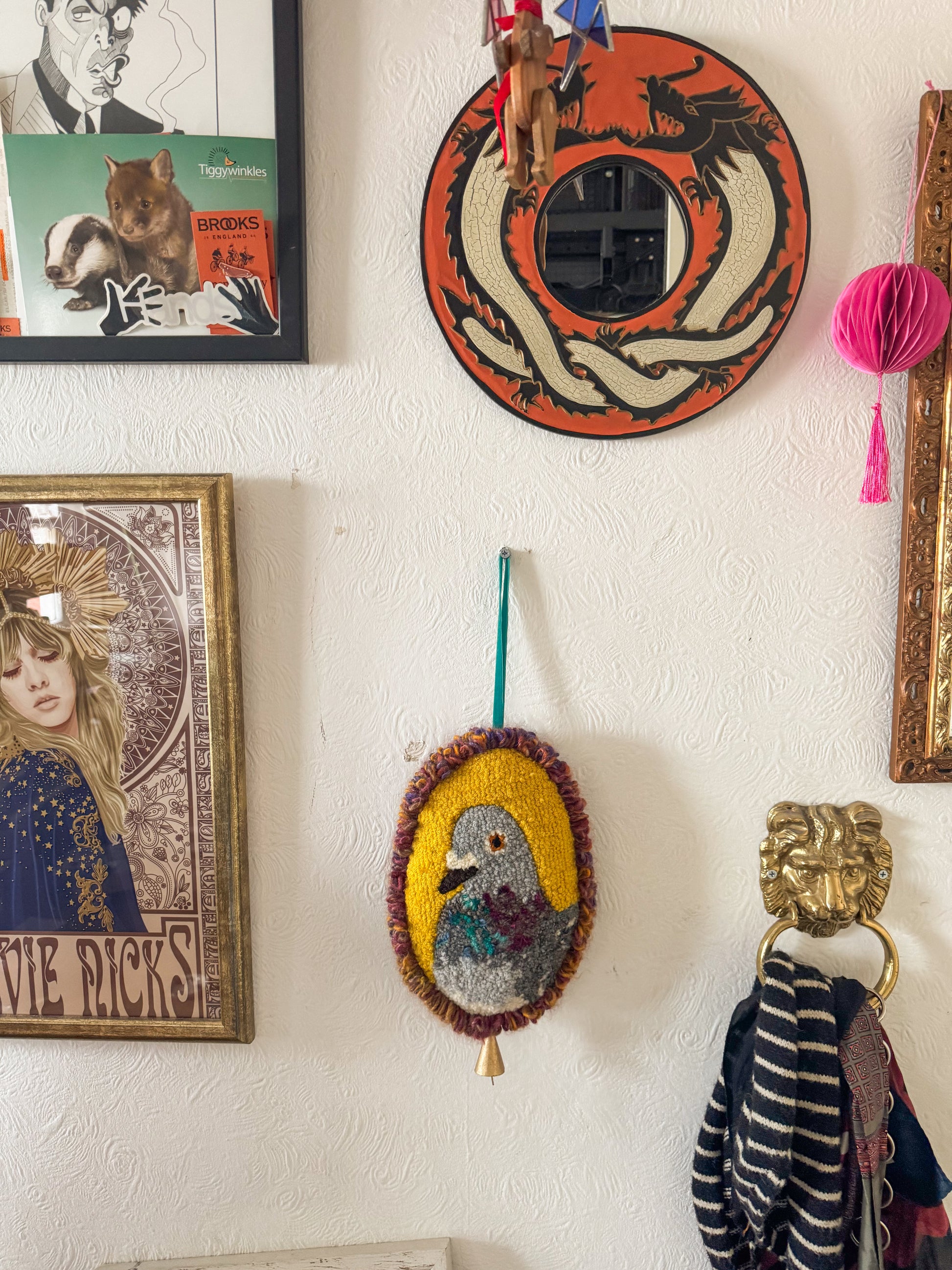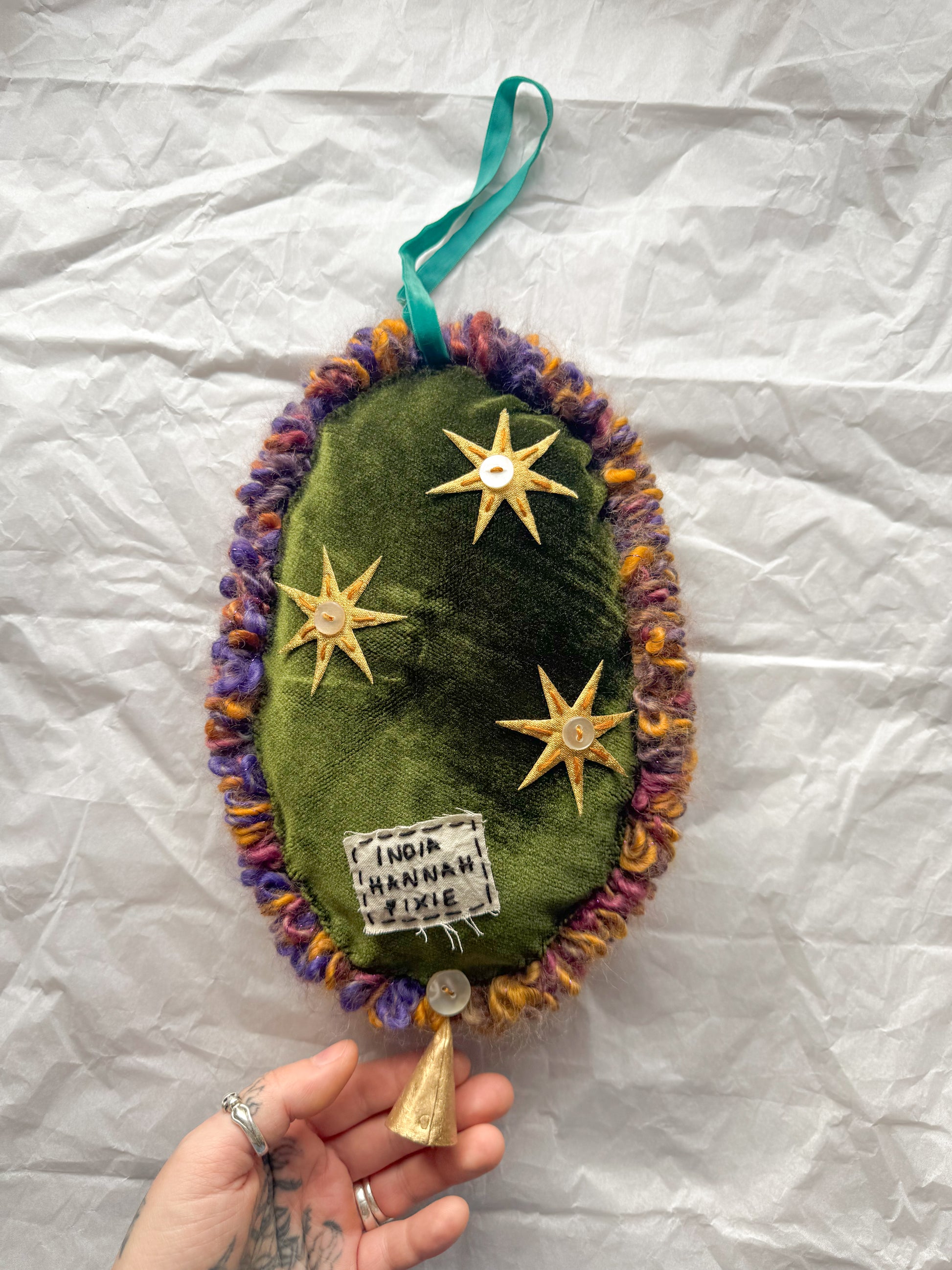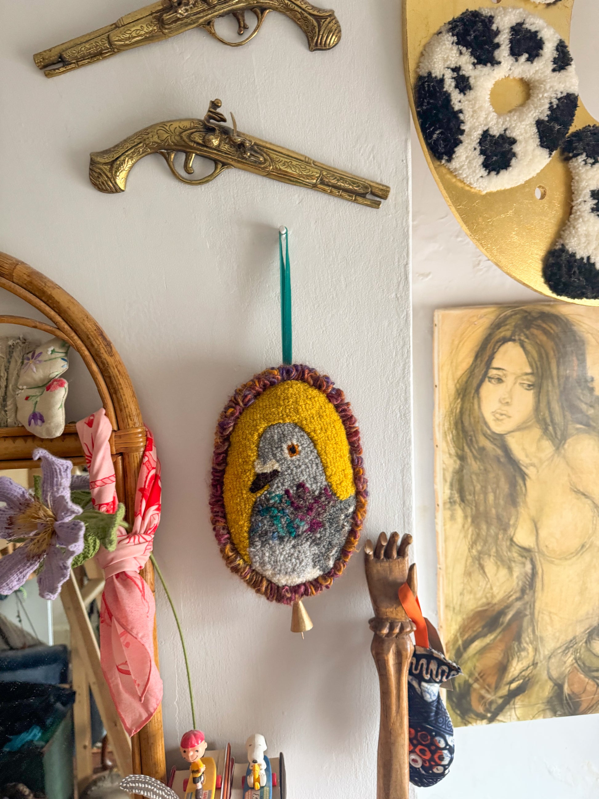 The front features a punch needle pigeon that is made using almost entirely vintage and second hand yarn in so many different fibres and colours, so much texture. The yarn ‘border’ was created with a vintage tufting tool. The back was hand sewn using some vintage velvet fabric sourced from a charity shop and hand finished and embellished with some gold fabric stars, pearly buttons , an embroidered label and a gold bell. Whilst this is piece is very tactile it is still a delicate art piece and should be treated with care!!