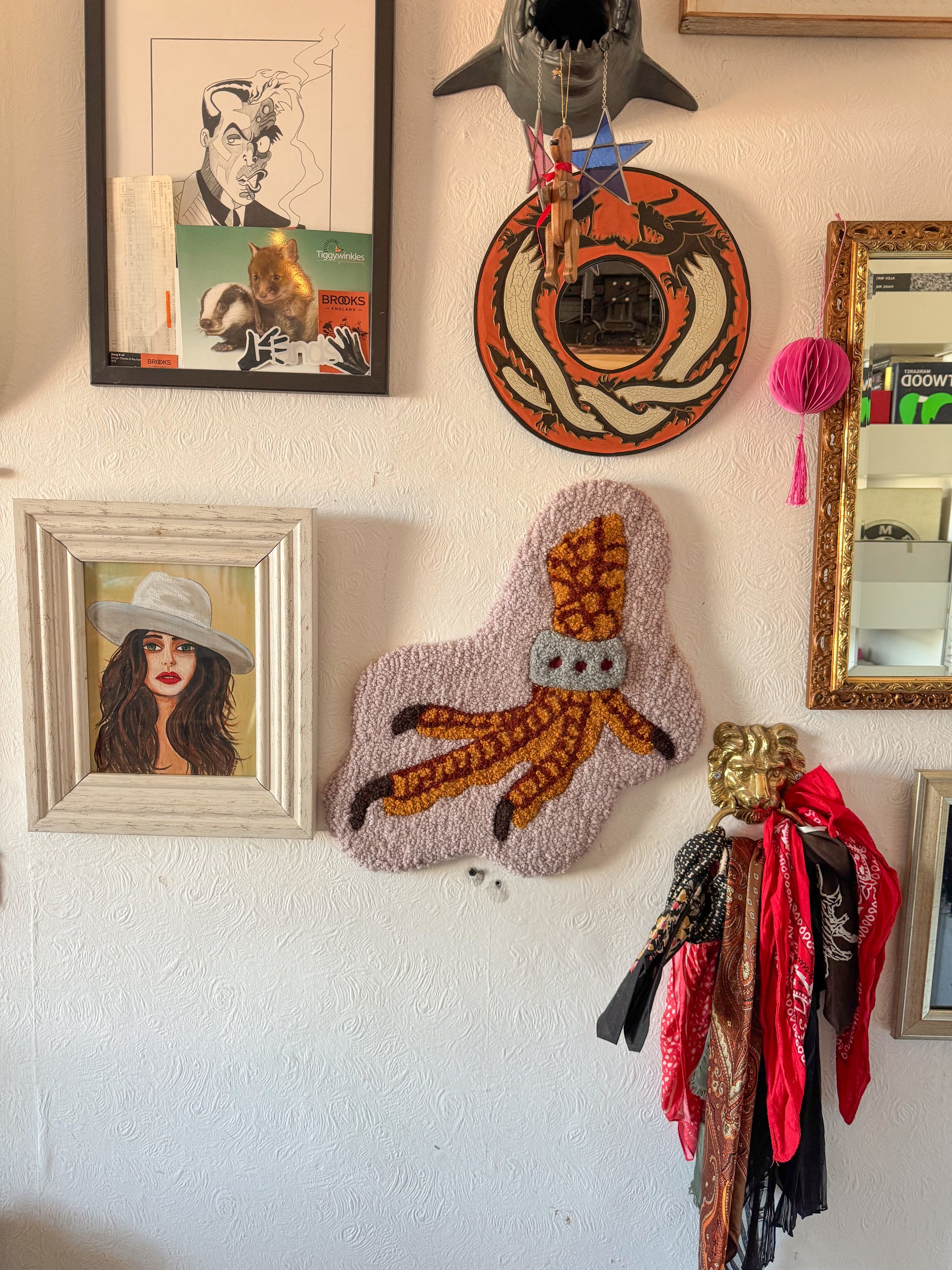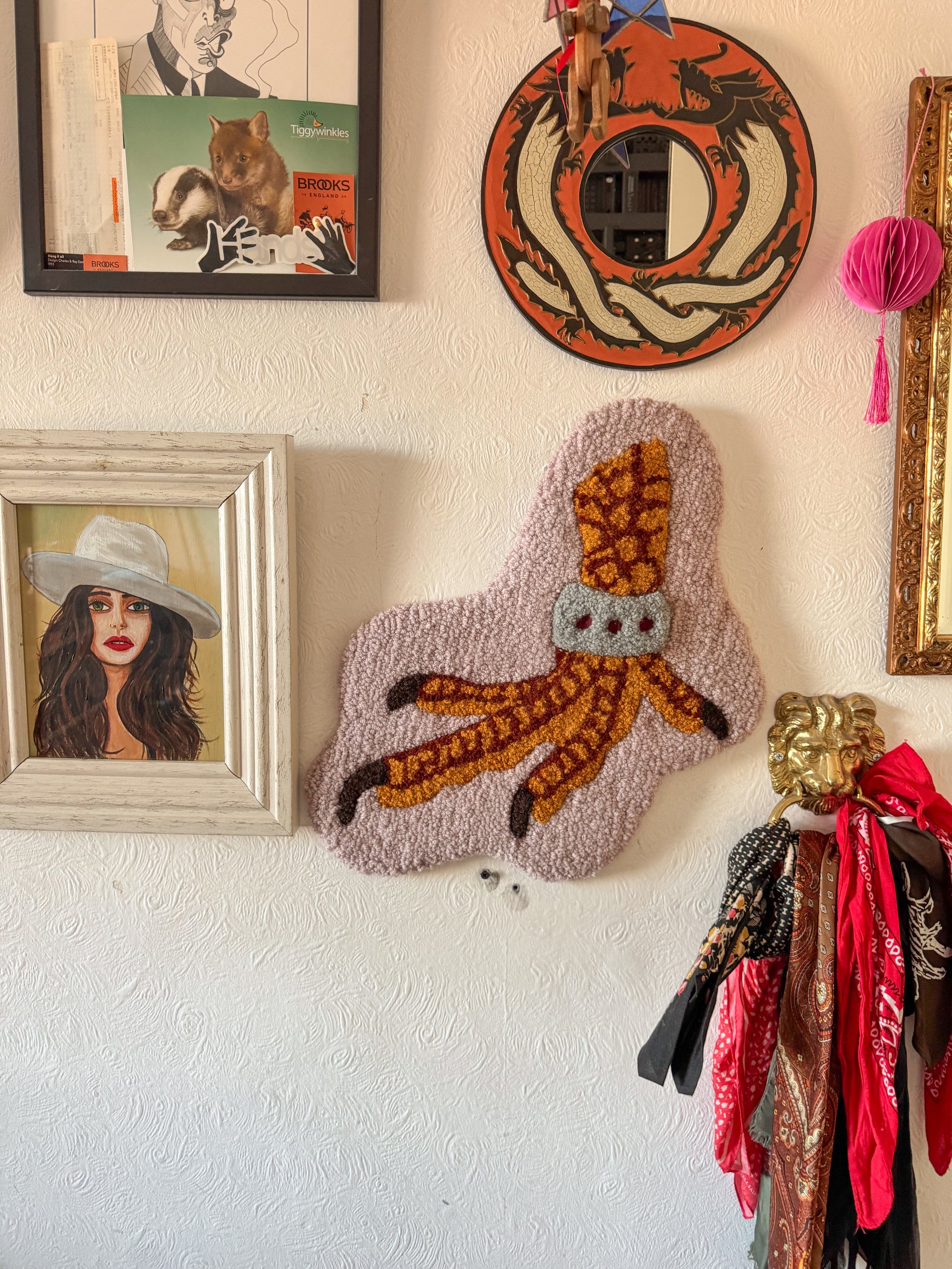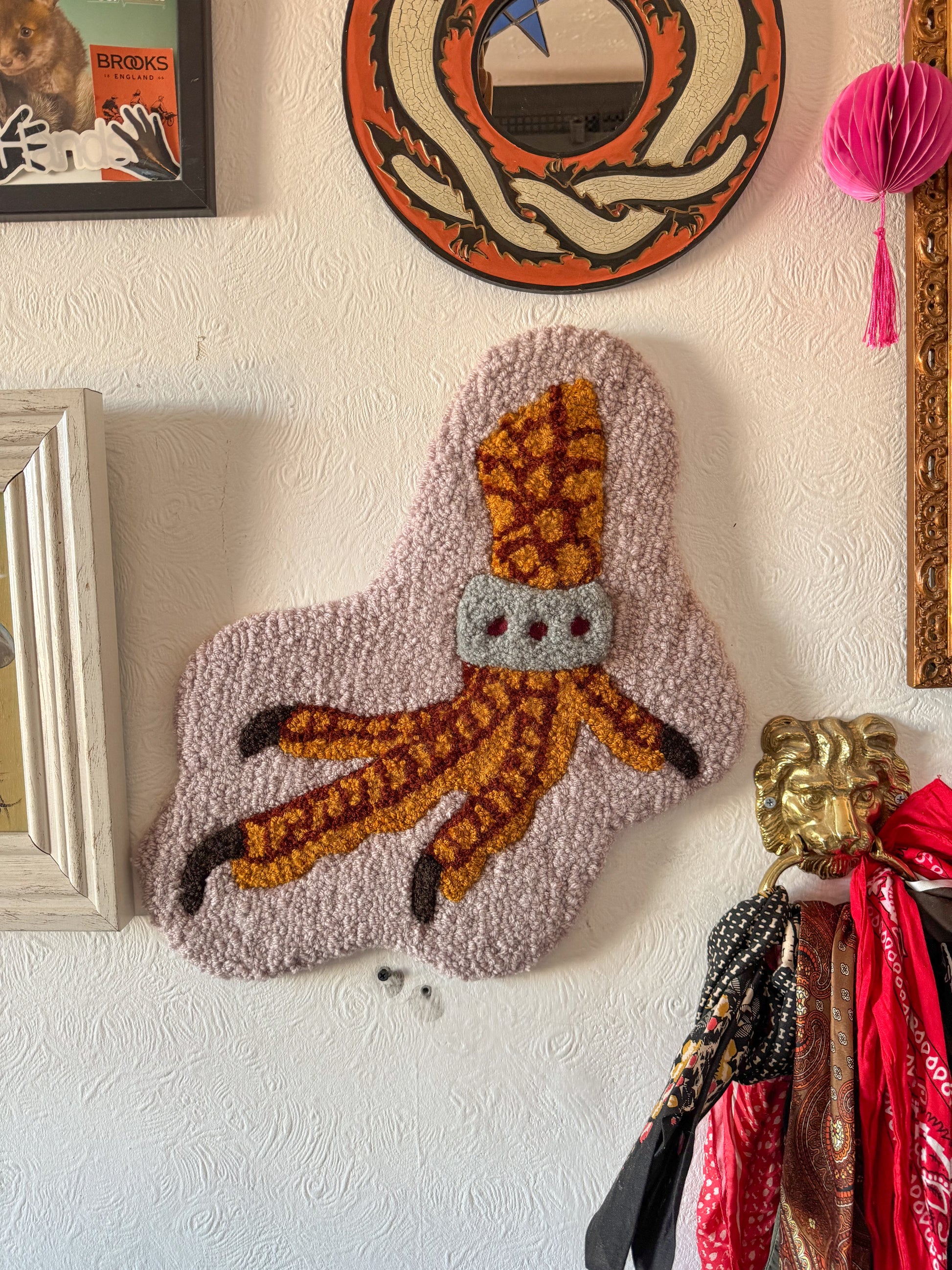 This piece has a D ring attachment for easy hanging and is finished with a hand embroidered label