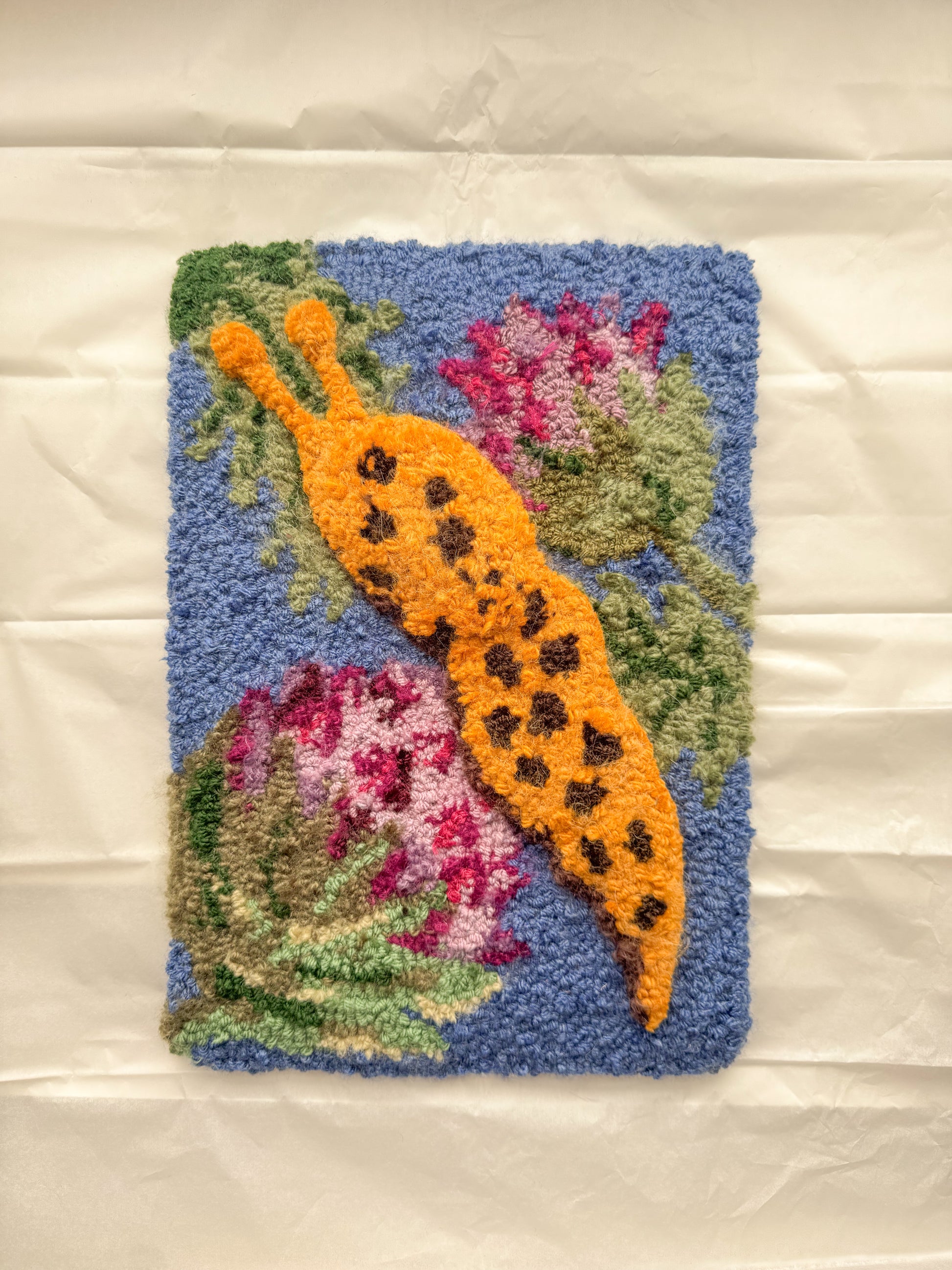 This is a one off art piece and I used a bunch of vintage and second hand yarn to create it including lots of boucle and different fibres to create lots of texture. I also used different needles lengths to create lots of depth and texture in the slug.