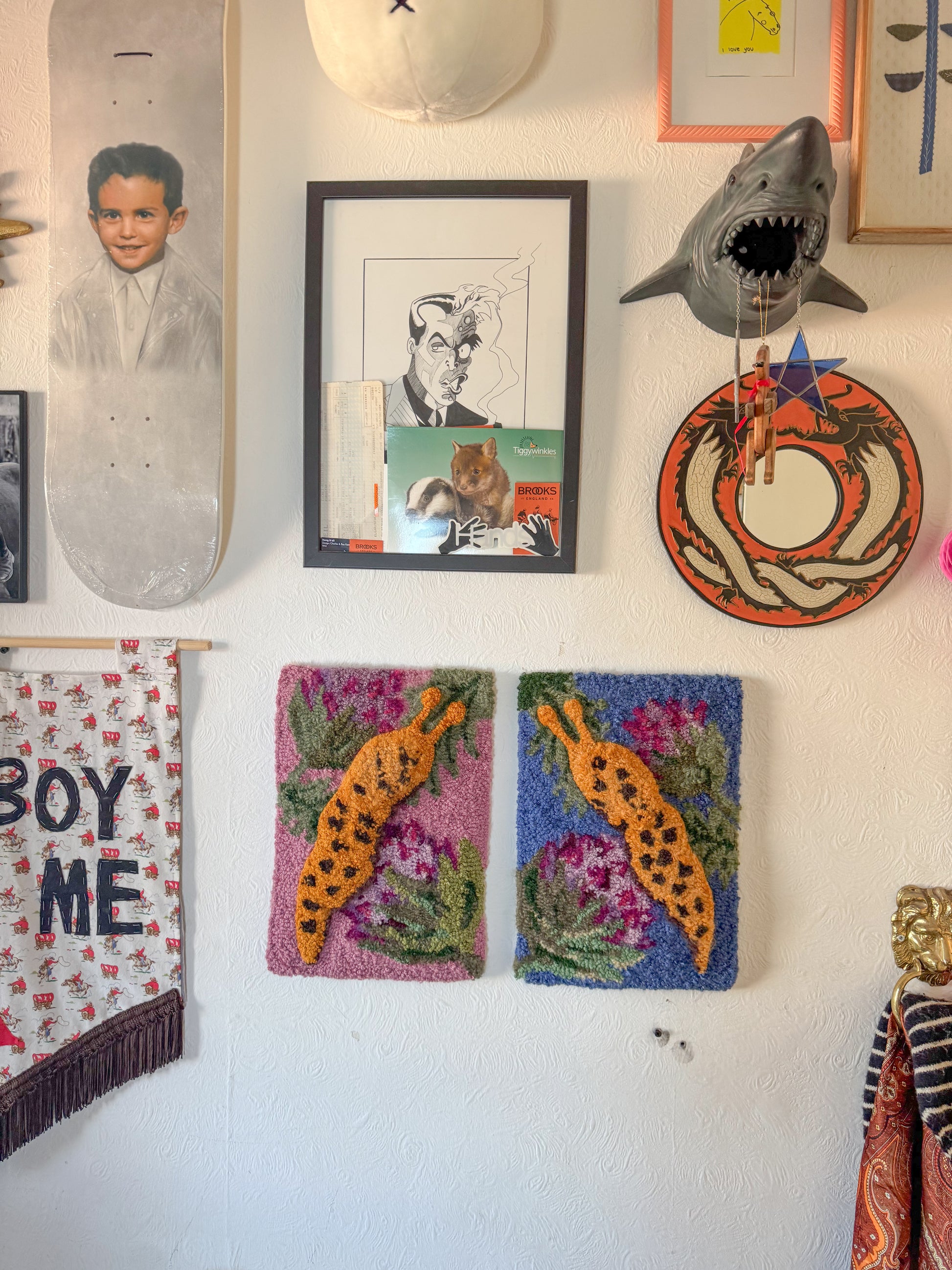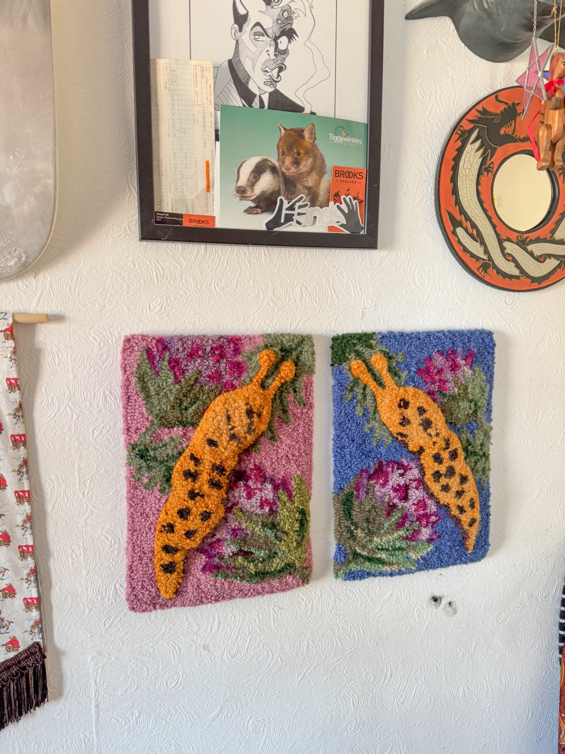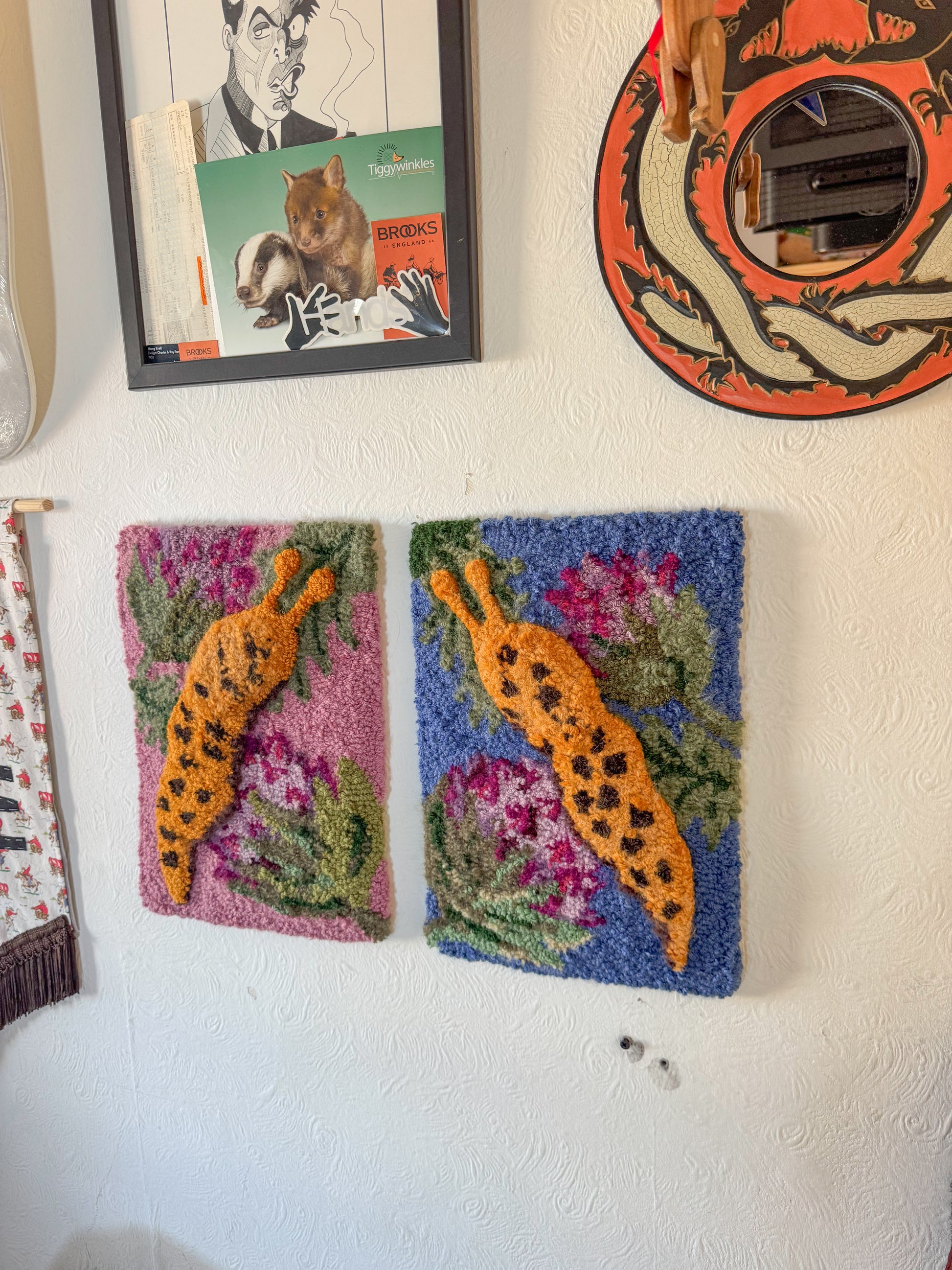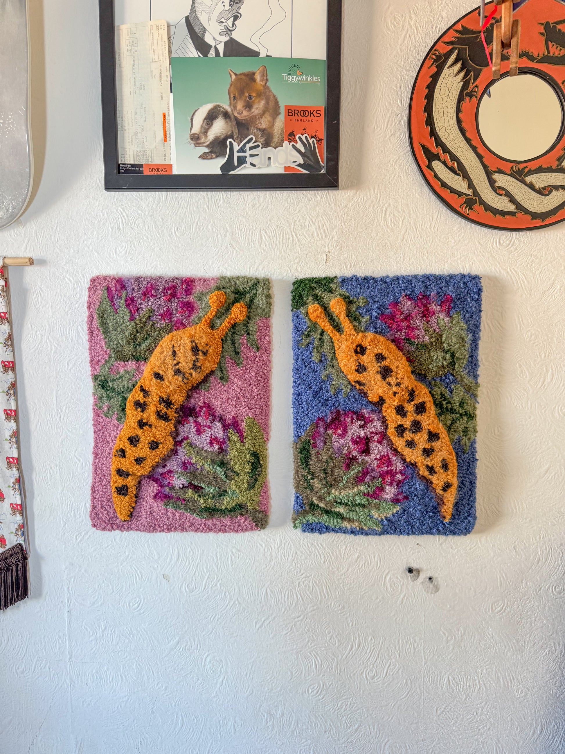 Made entirely by hand using a vintage tufting tool, the backing has been hand stitched with an embroidered label attached. Also has D ring attachments for easy hanging.