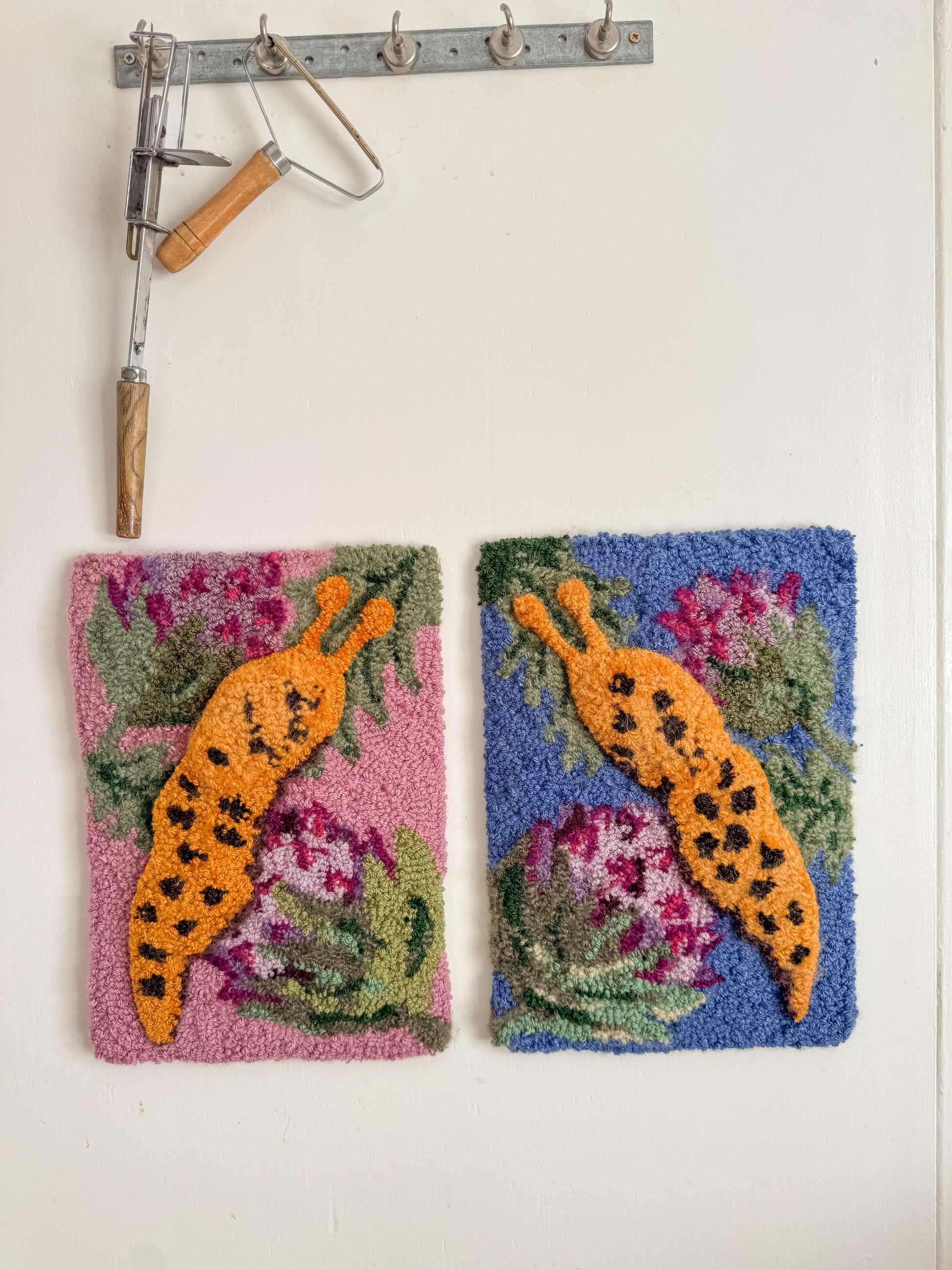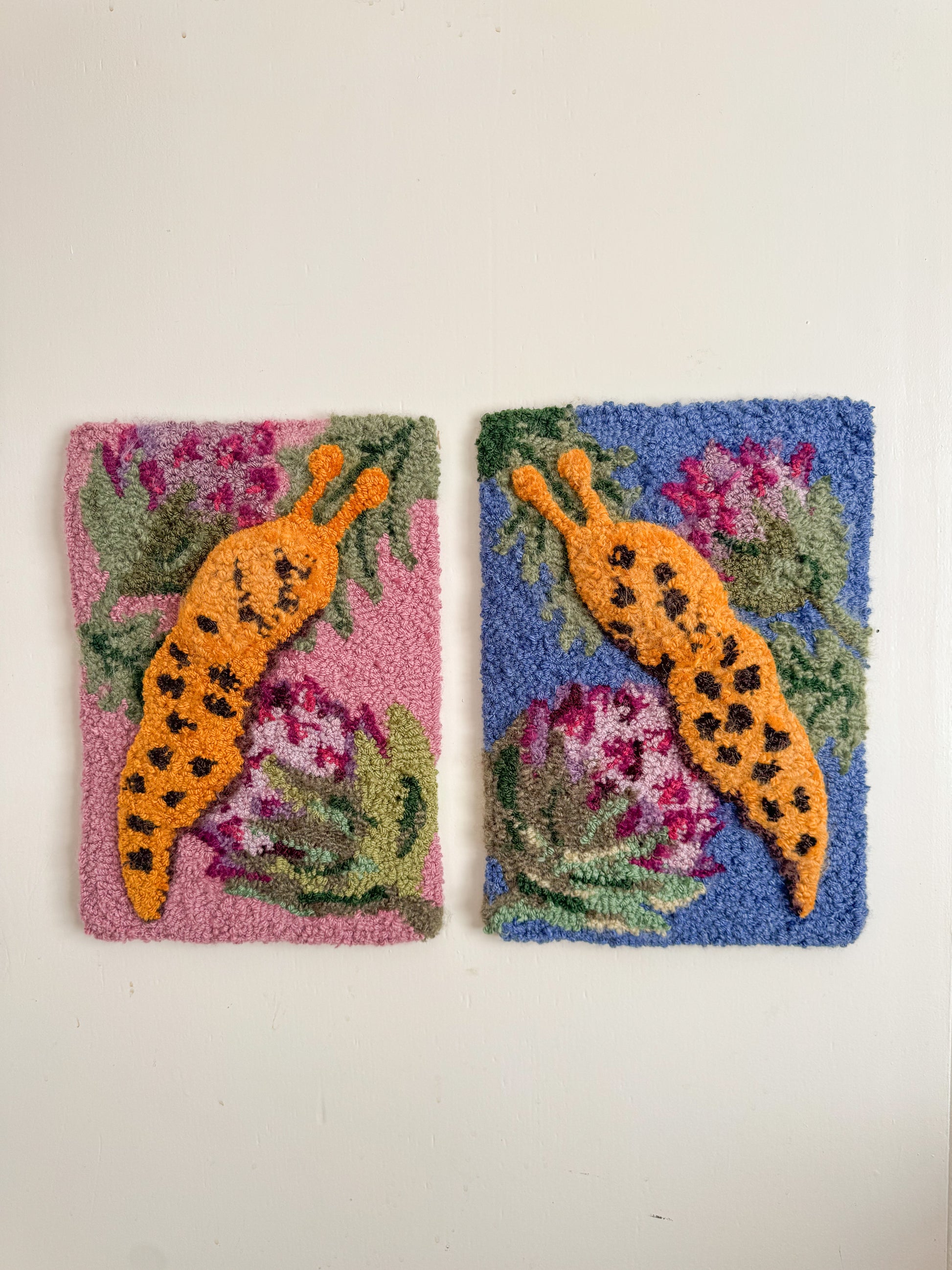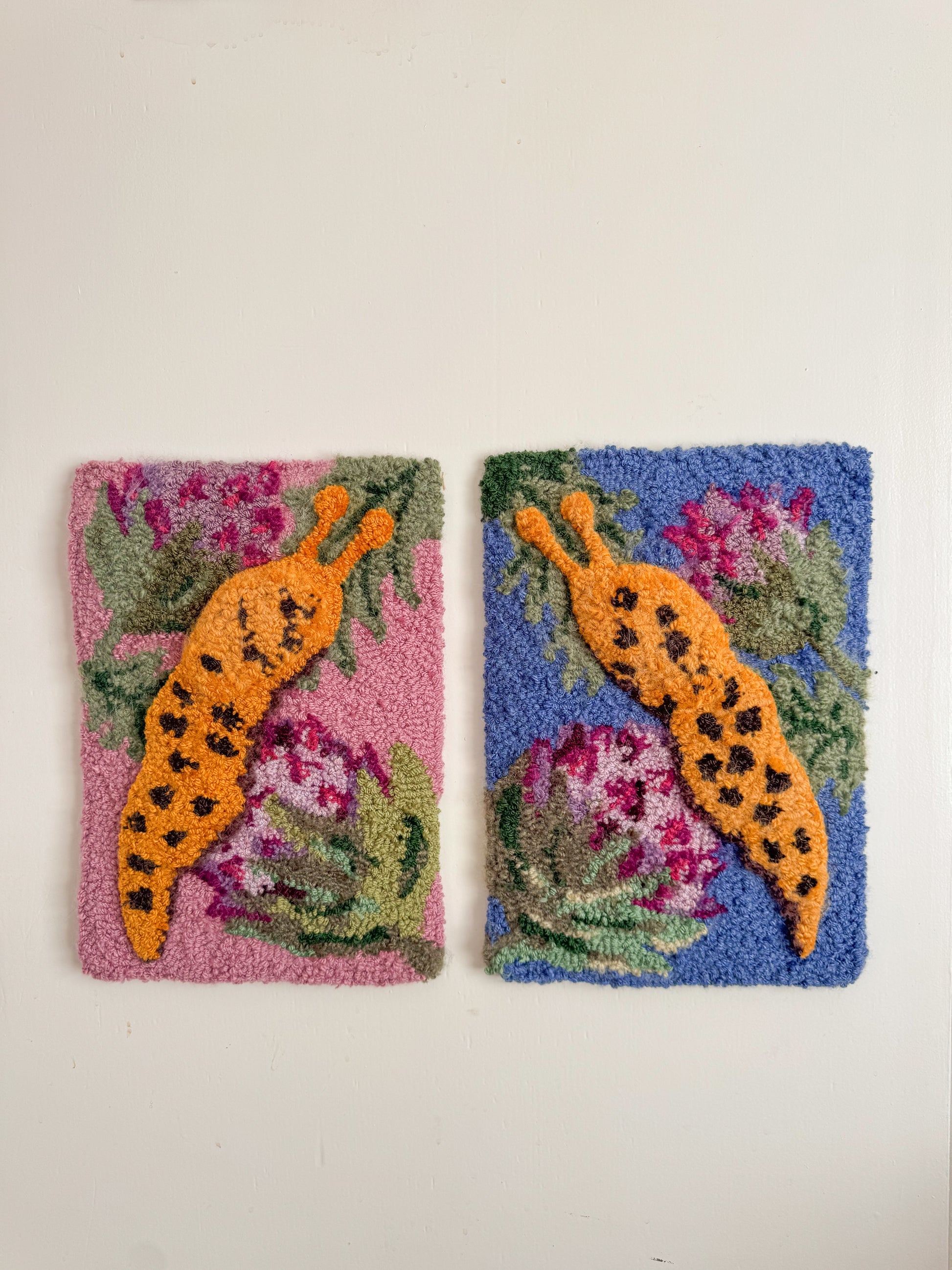 This is a one off art piece and I used a bunch of vintage and second hand yarn to create it including lots of boucle and different fibres to create lots of texture. I also used different needles lengths to create lots of depth and texture in the slug.