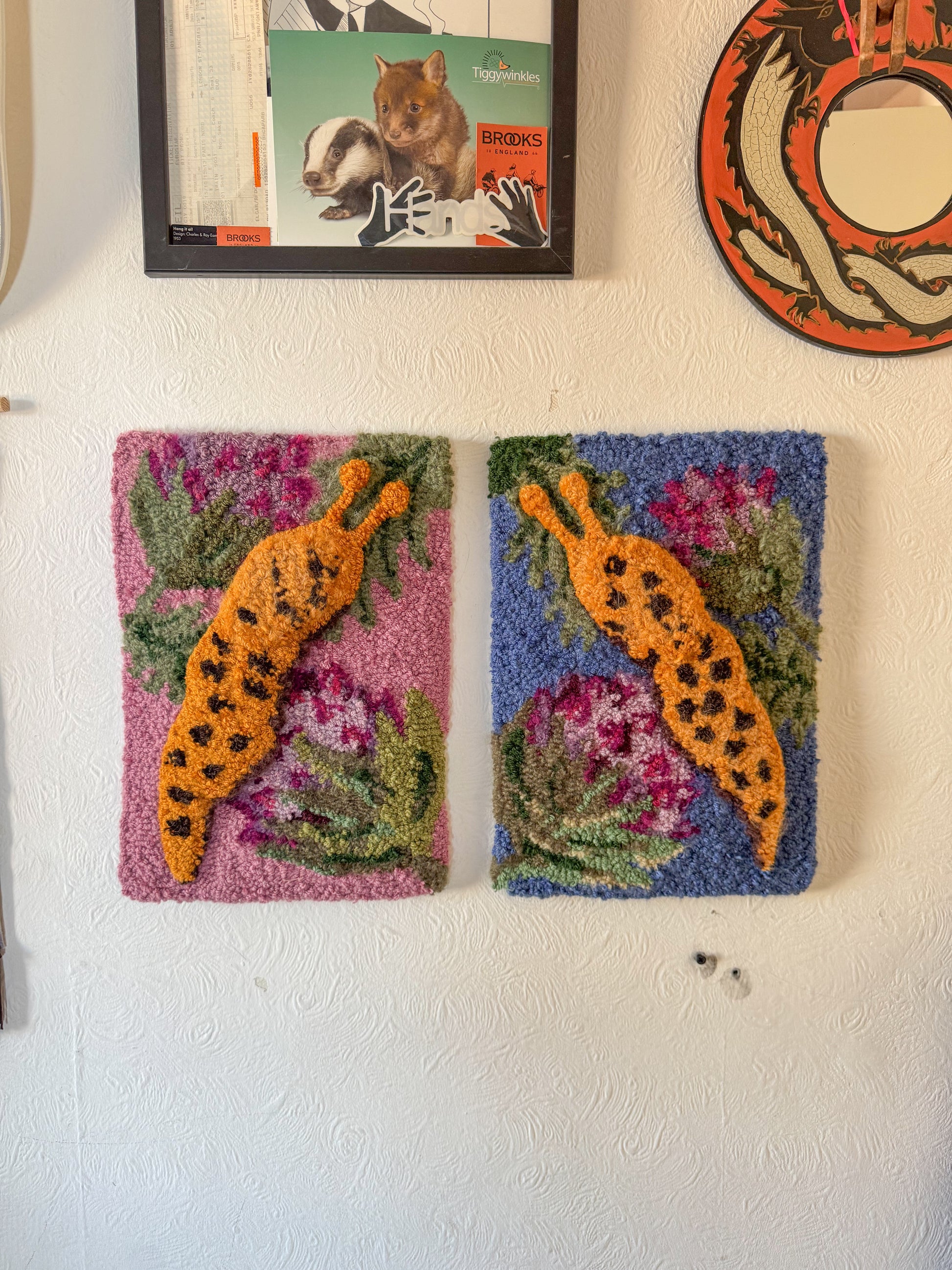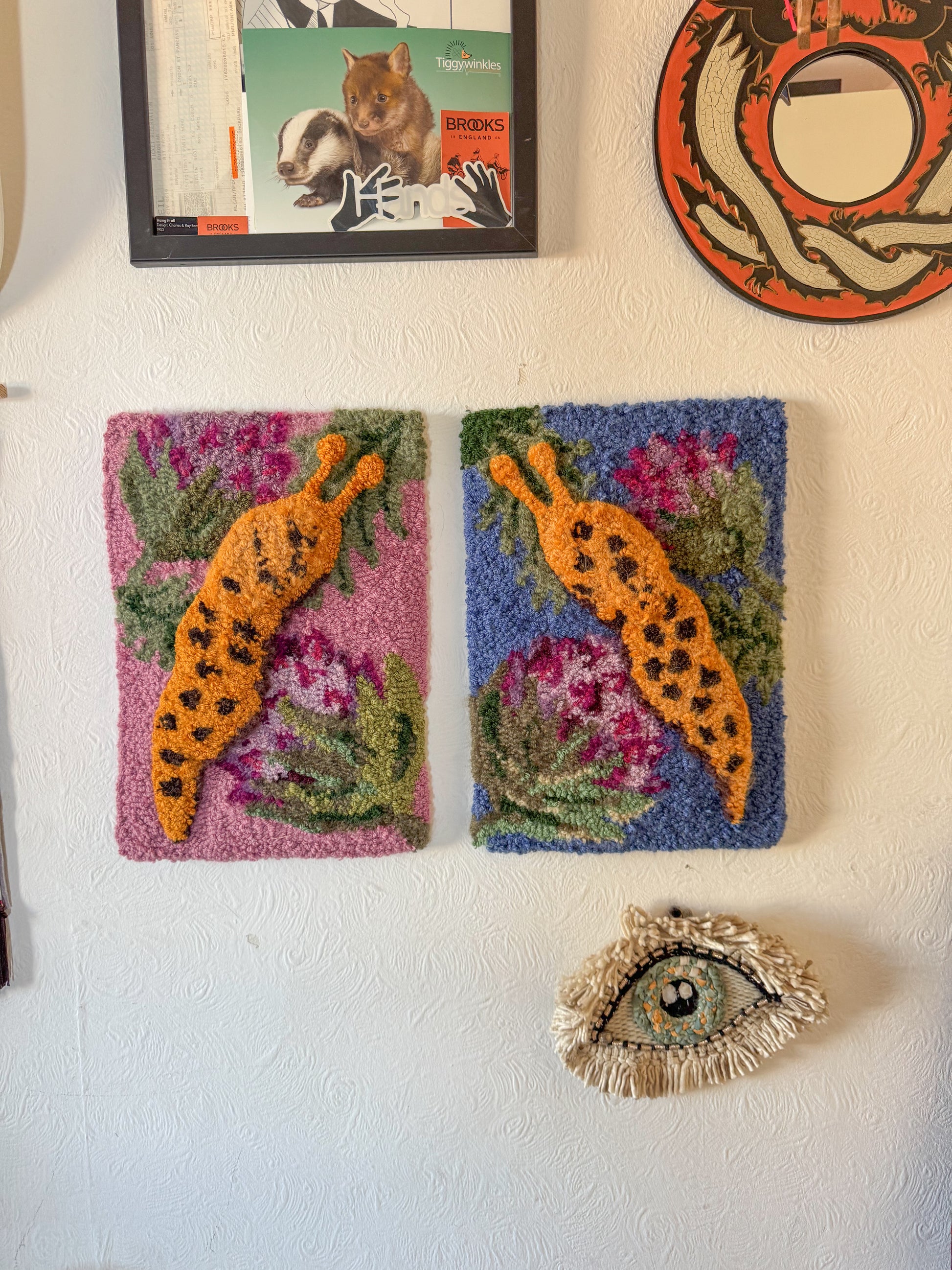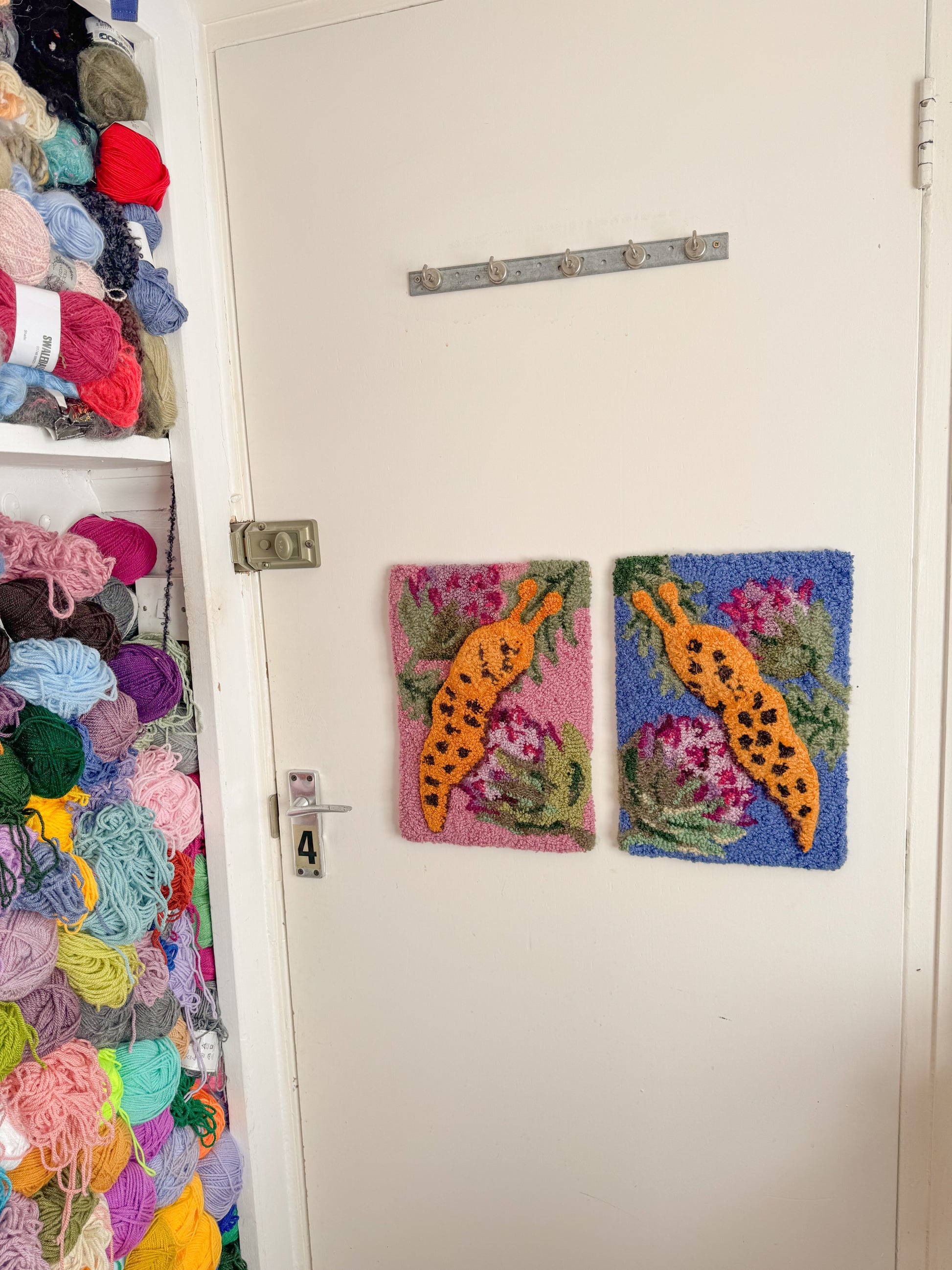 This is a one off art piece and I used a bunch of vintage and second hand yarn to create it including lots of boucle and different fibres to create lots of texture. I also used different needles lengths to create lots of depth and texture in the slug.