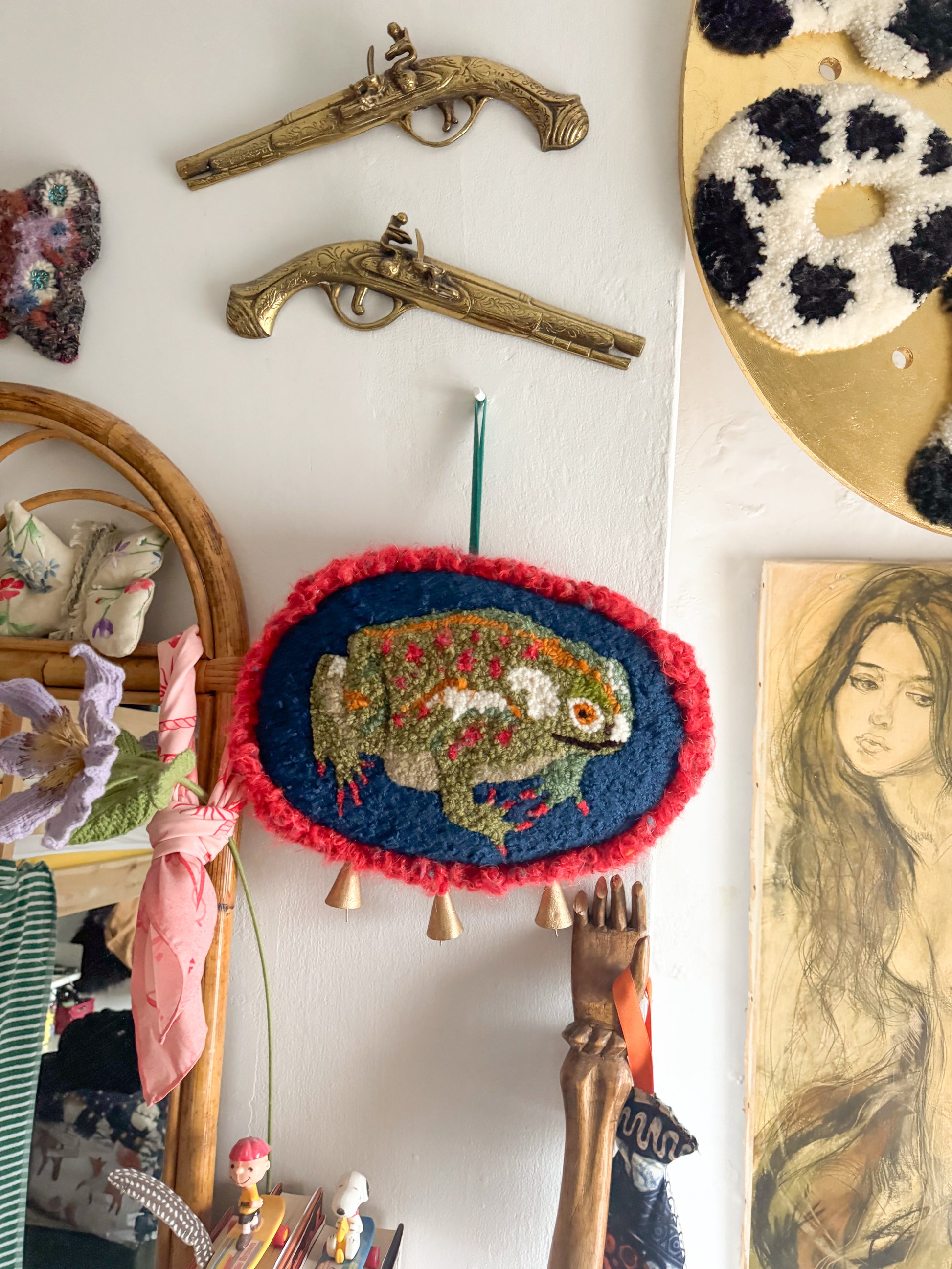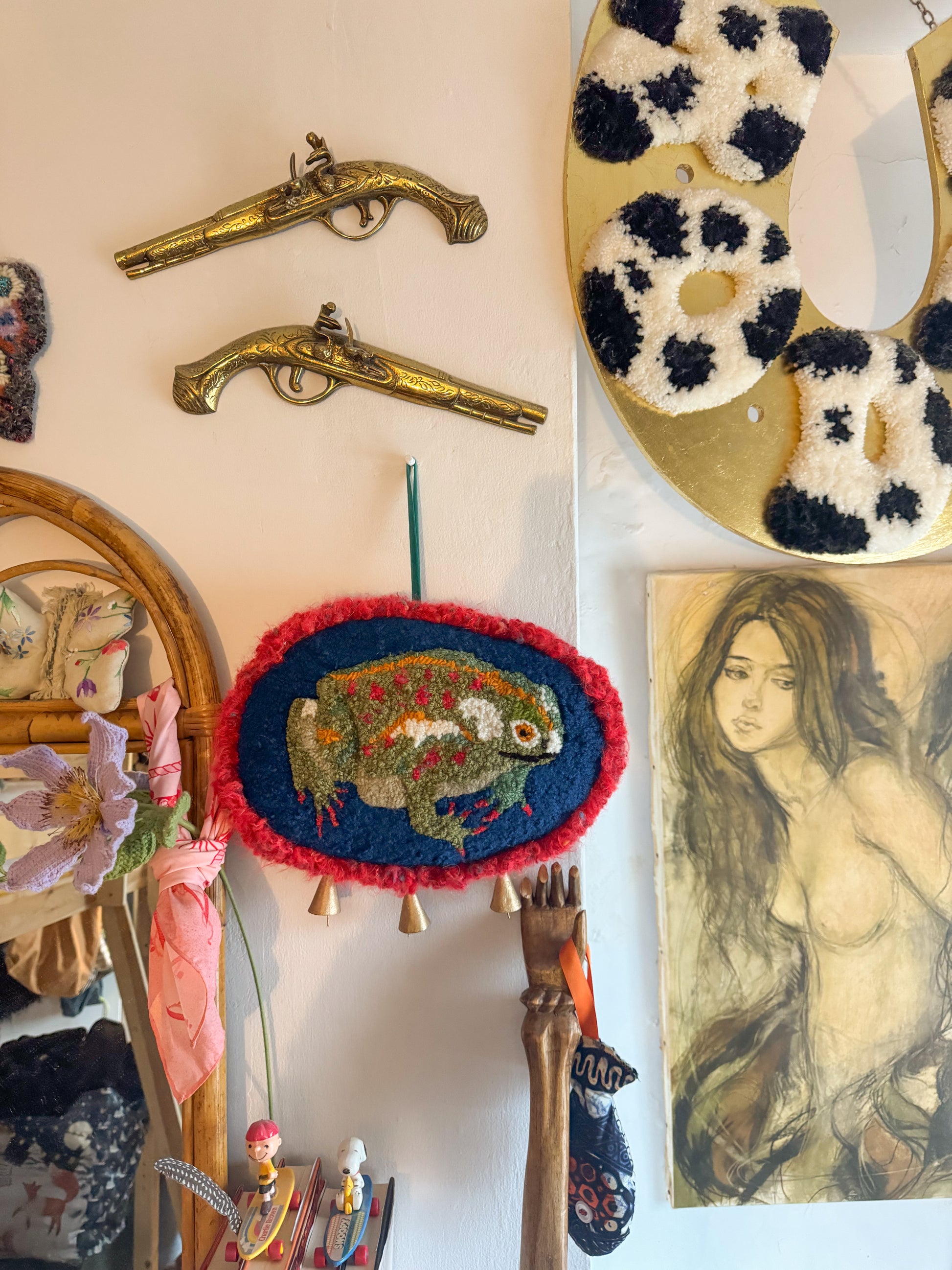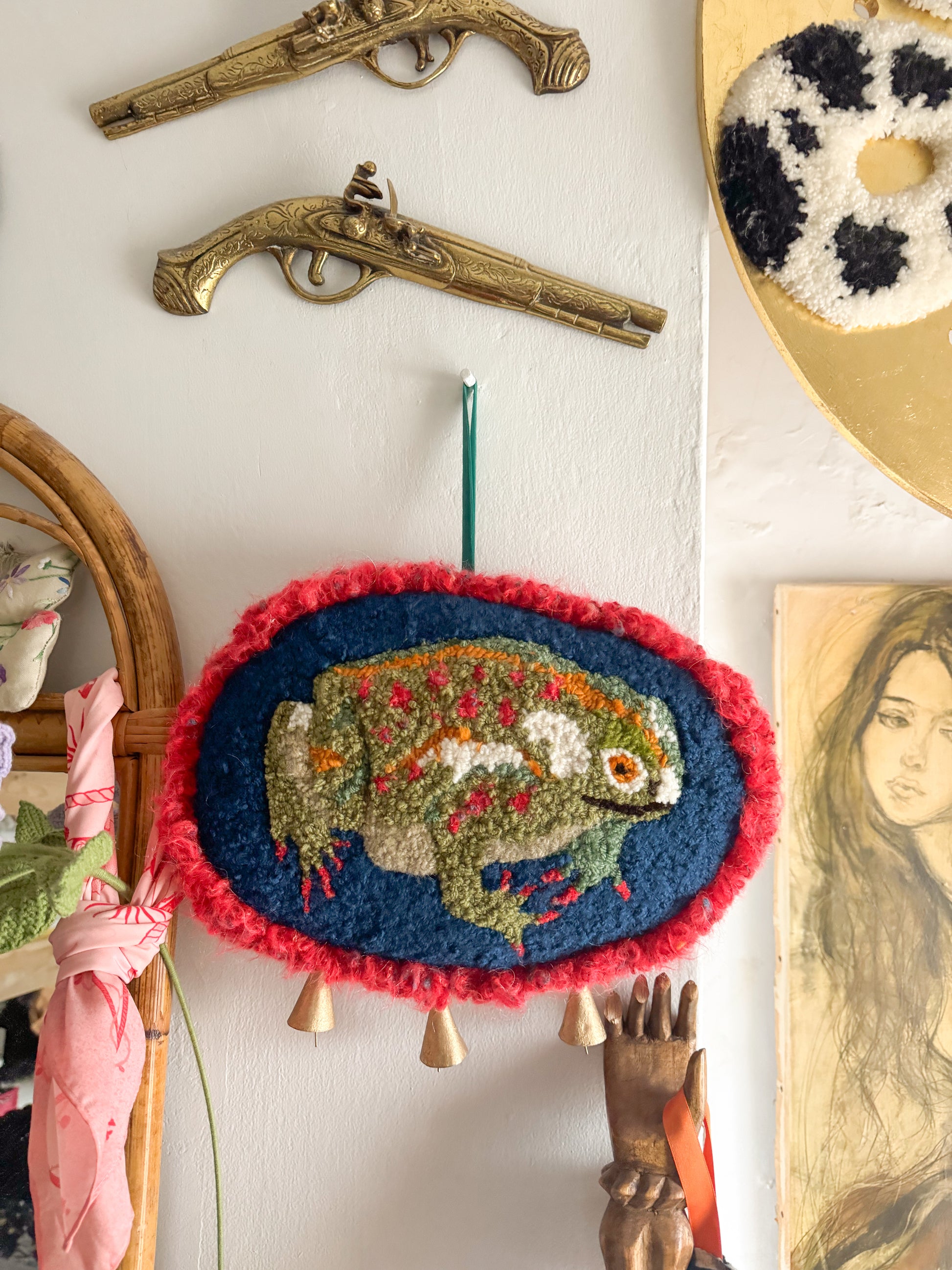 The front features a punch needle toad that is made using almost entirely vintage and second hand yarn in so many different fibres and colours, so much texture. The back was hand sewn using some vintage velvet fabric sourced from a charity shop and hand finished and embellished with some gold fabric stars, gold beads, an embroidered label, gold bells and little vintage pearlescent buttons. The stuffing on the inside was also sourced secondhand and whilst it gives the piece a ‘squishy’ and cushioned feel it is still a delicate art piece and should be treated with care!!