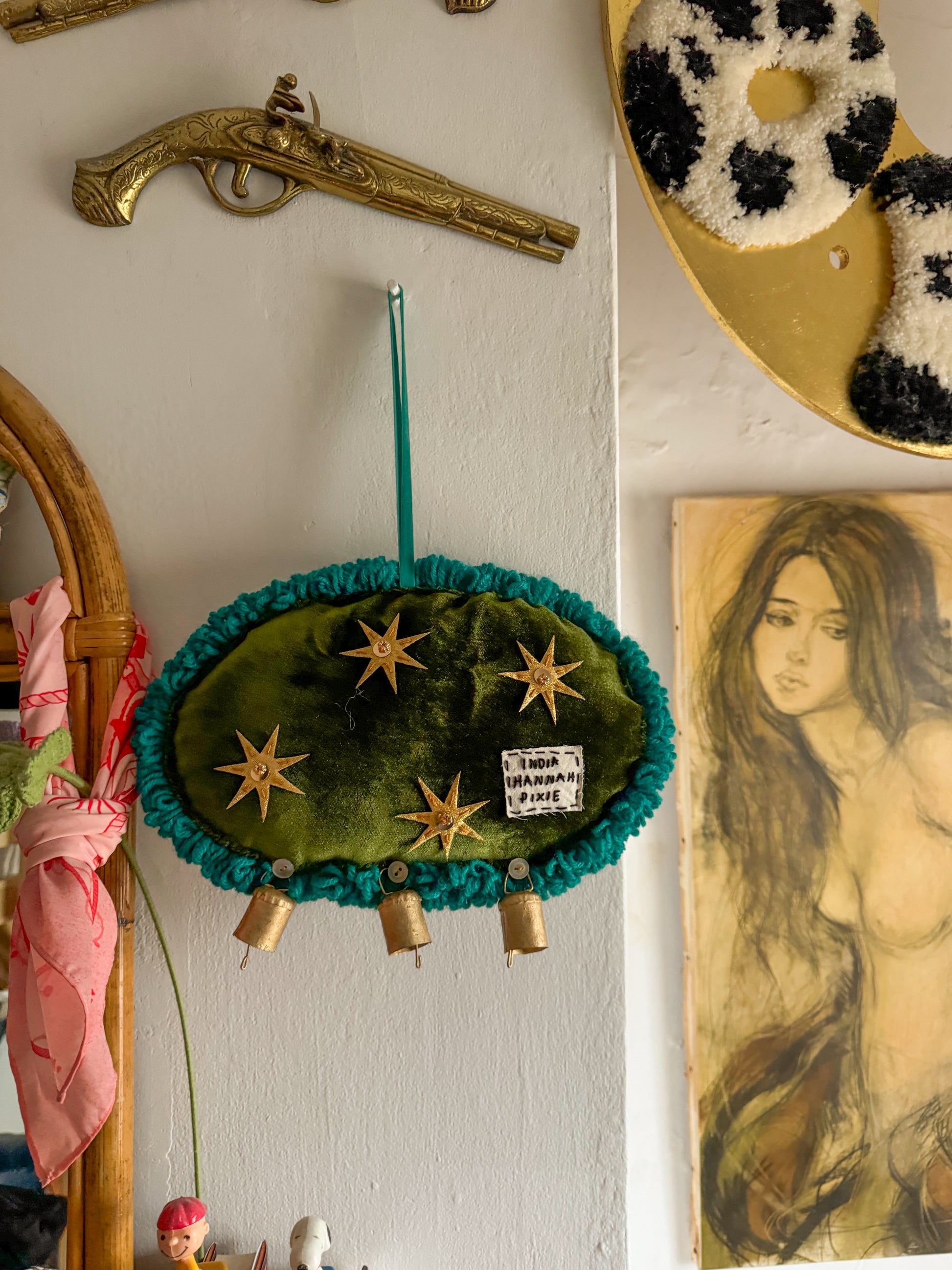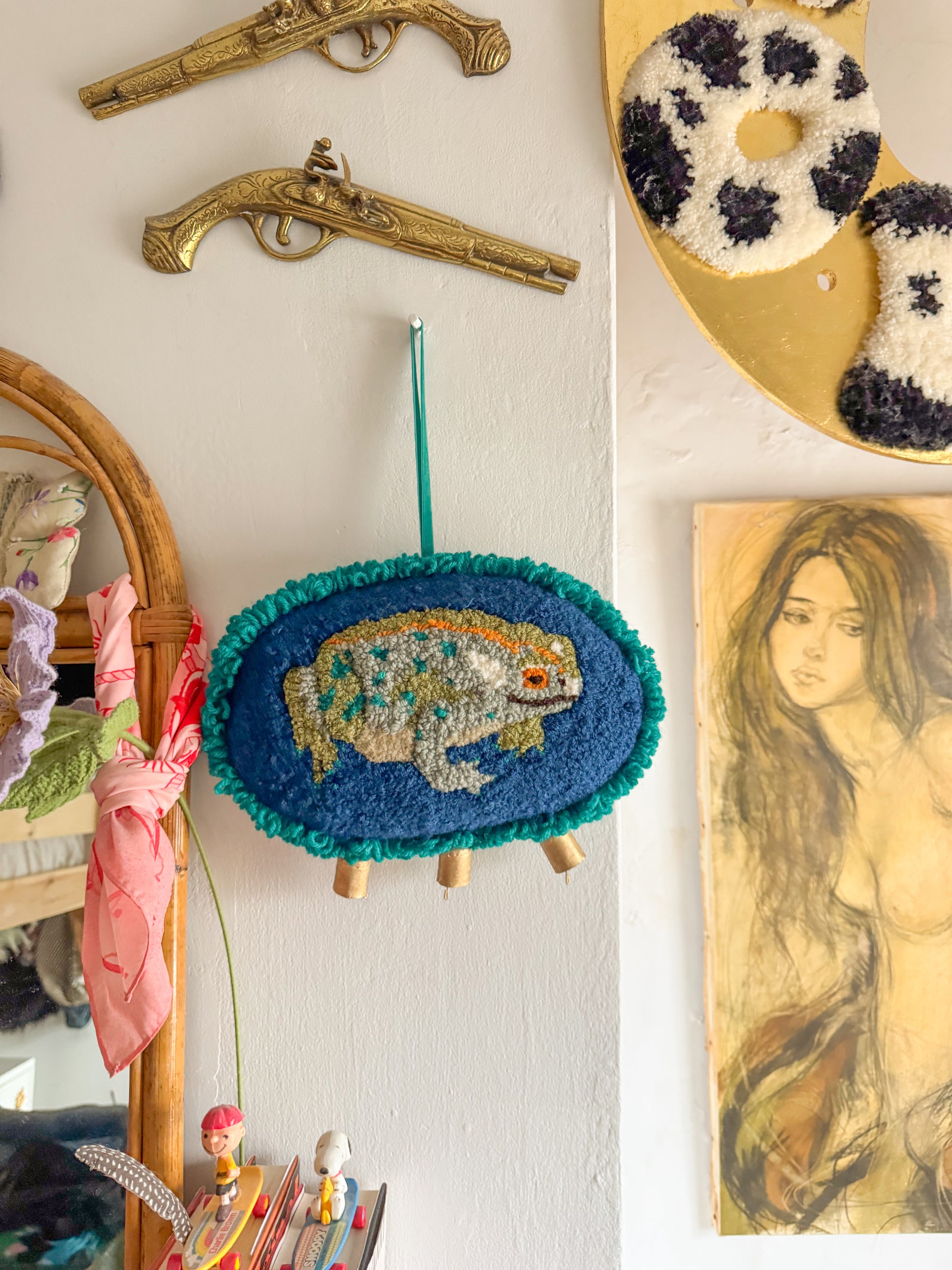 The front features a punch needle toad that is made using almost entirely vintage and second hand yarn in so many different fibres and colours, so much texture. The back was hand sewn using some vintage velvet fabric sourced from a charity shop and hand finished and embellished with some gold fabric stars, gold beads, an embroidered label, gold bells and little vintage pearlescent buttons. The stuffing on the inside was also sourced secondhand and whilst it gives the piece a ‘squishy’ and cushioned feel it is still a delicate art piece and should be treated with care!!