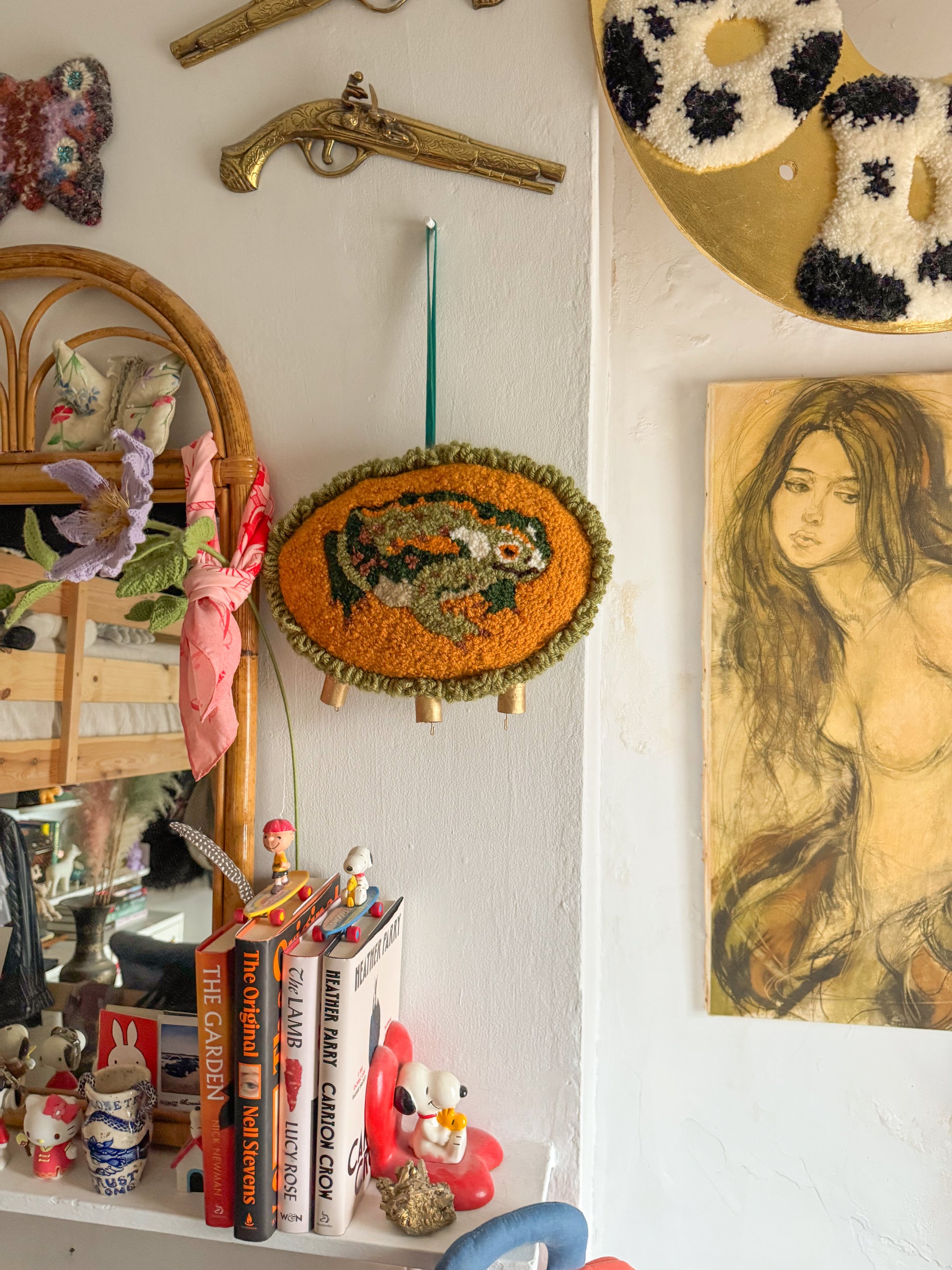 The front features a punch needle toad that is made using almost entirely vintage and second hand yarn in so many different fibres and colours, so much texture. The back was hand sewn using some vintage velvet fabric sourced from a charity shop and hand finished and embellished with some gold fabric stars, gold beads, an embroidered label, gold bells and little vintage pearlescent buttons. The stuffing on the inside was also sourced secondhand and whilst it gives the piece a ‘squishy’ and cushioned feel it is still a delicate art piece and should be treated with care!!
