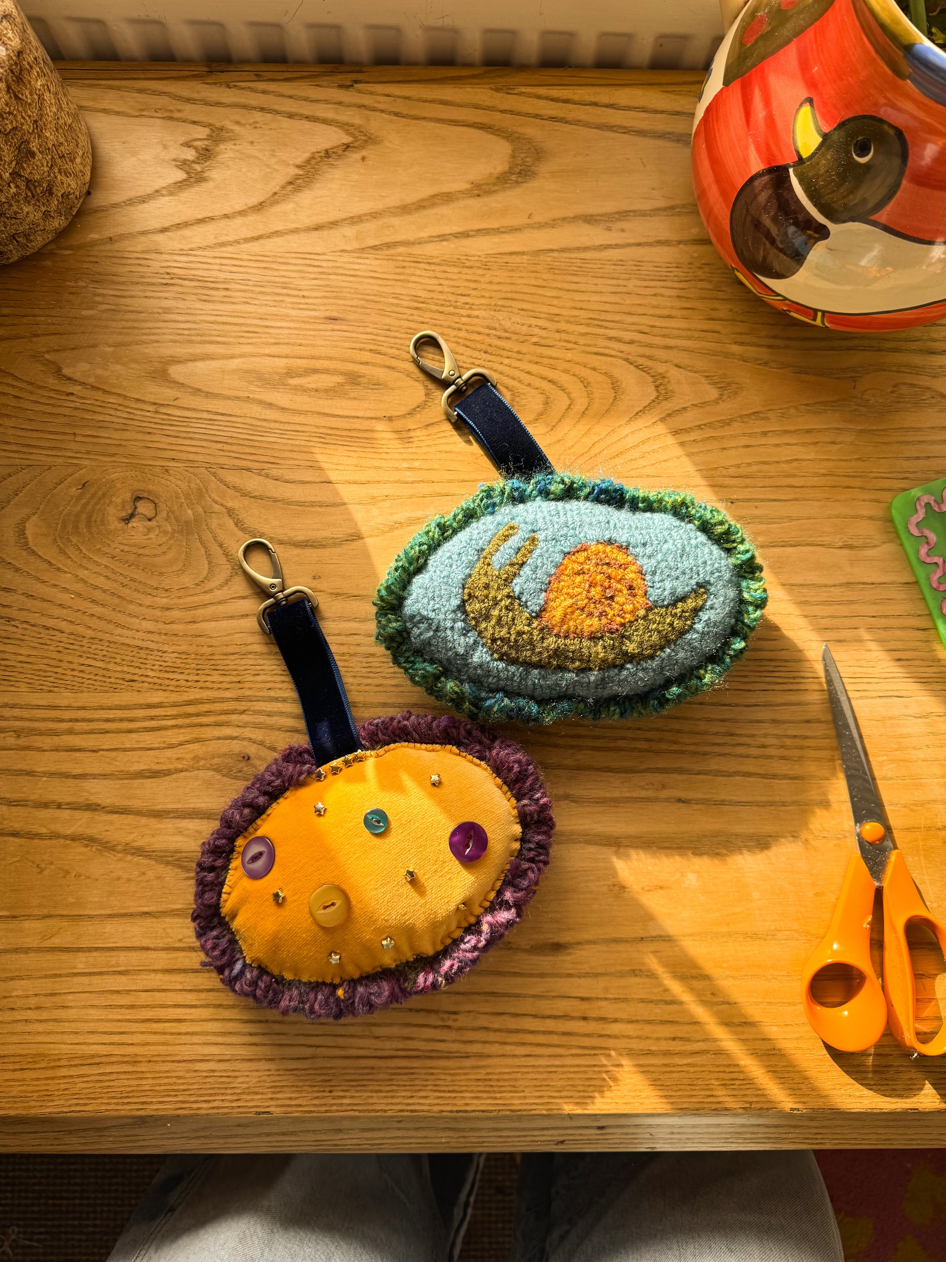 A one off and slow made Snail bag charm, hand drawn and kooky